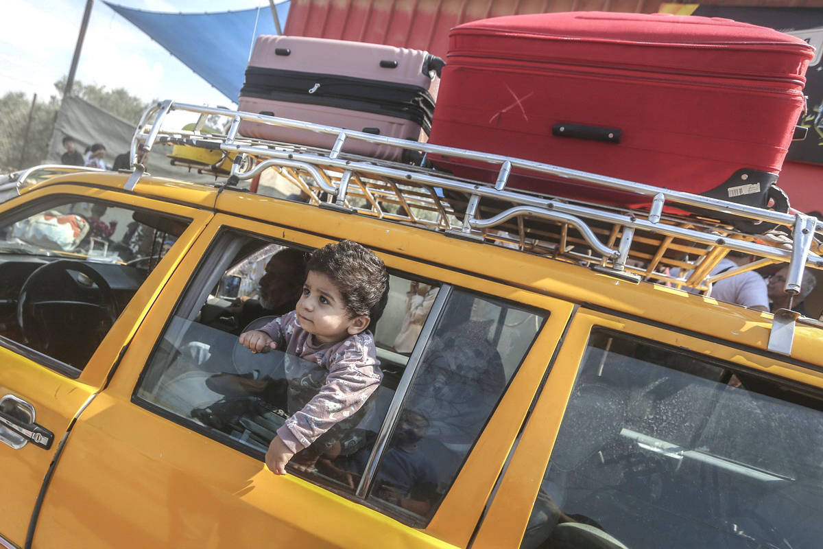 当地时间2023年10月16日,巴勒斯坦加沙地带拉法过境点,一名巴勒斯坦儿童从车窗向外窥视。