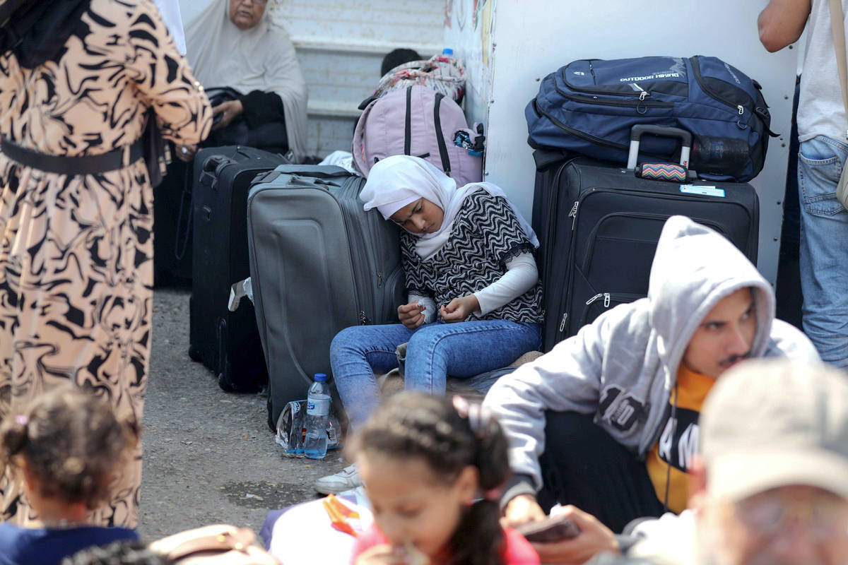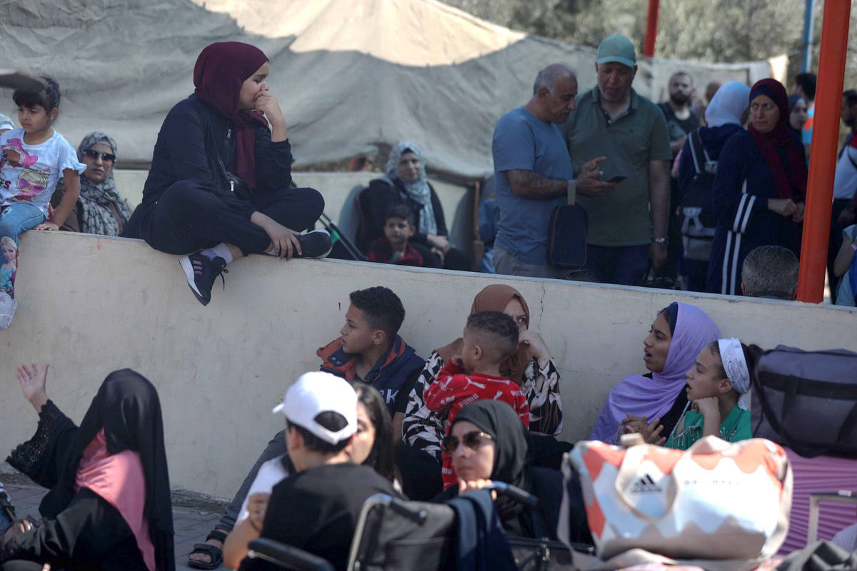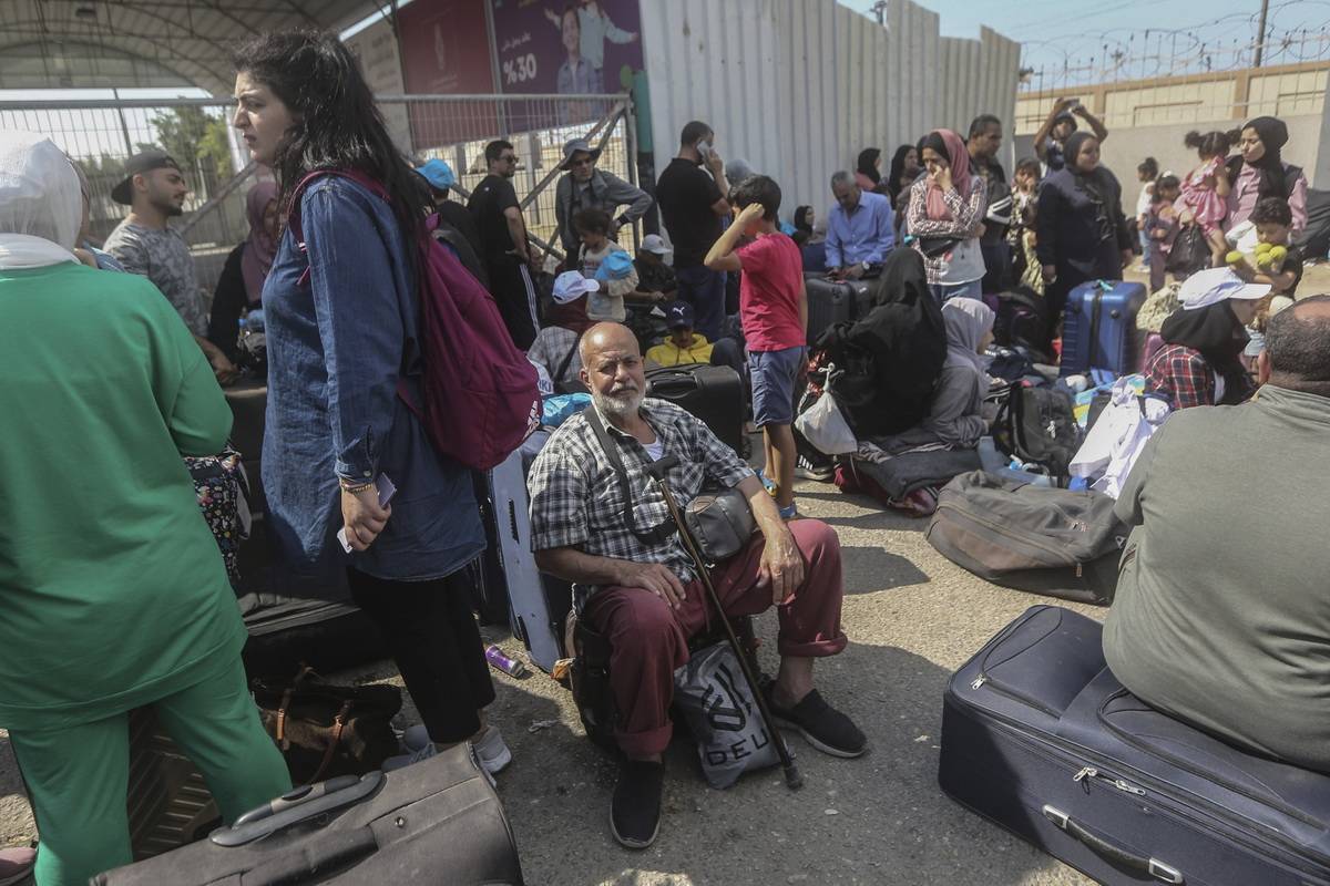 当地时间2023年10月16日,巴勒斯坦加沙地带拉法过境点,持有外国护照的巴勒斯坦民众等待援助和进入埃及。