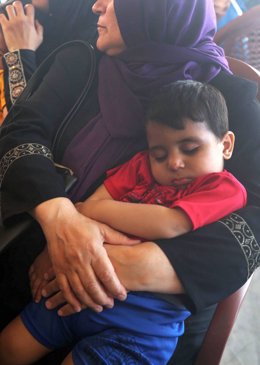 当地时间2023年10月16日,巴勒斯坦加沙地带拉法口岸,一名男童在家长怀中入睡。