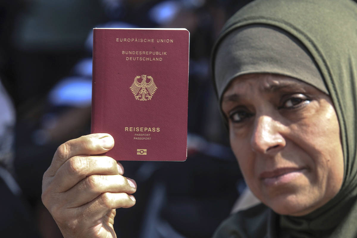 当地时间2023年10月14日,巴勒斯坦加沙地带,一名巴勒斯坦妇女在拉法过境点等待时展示她的德国护照。