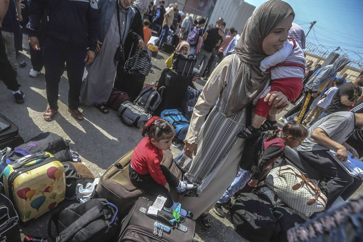 当地时间2023年10月16日,巴勒斯坦加沙地带拉法过境点,持有外国护照的巴勒斯坦妇女抱着孩子等待进入埃及。