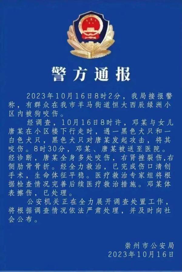 16日下午,崇州市公安局发布警情通报:经调查,16日8时许,邓某与女儿唐某在小区楼下行走时,遇一黑色犬只和一白色犬只,黑色犬只对唐某发起攻击,将其咬伤。