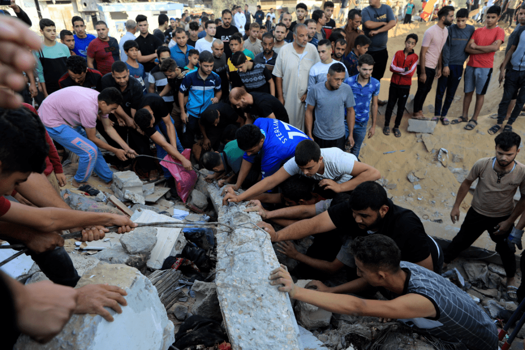 ▲10月16日,在加沙地带南部城市汗尤尼斯,人们在遭以色列袭击后的建筑废墟中救援伤者。图/新华社