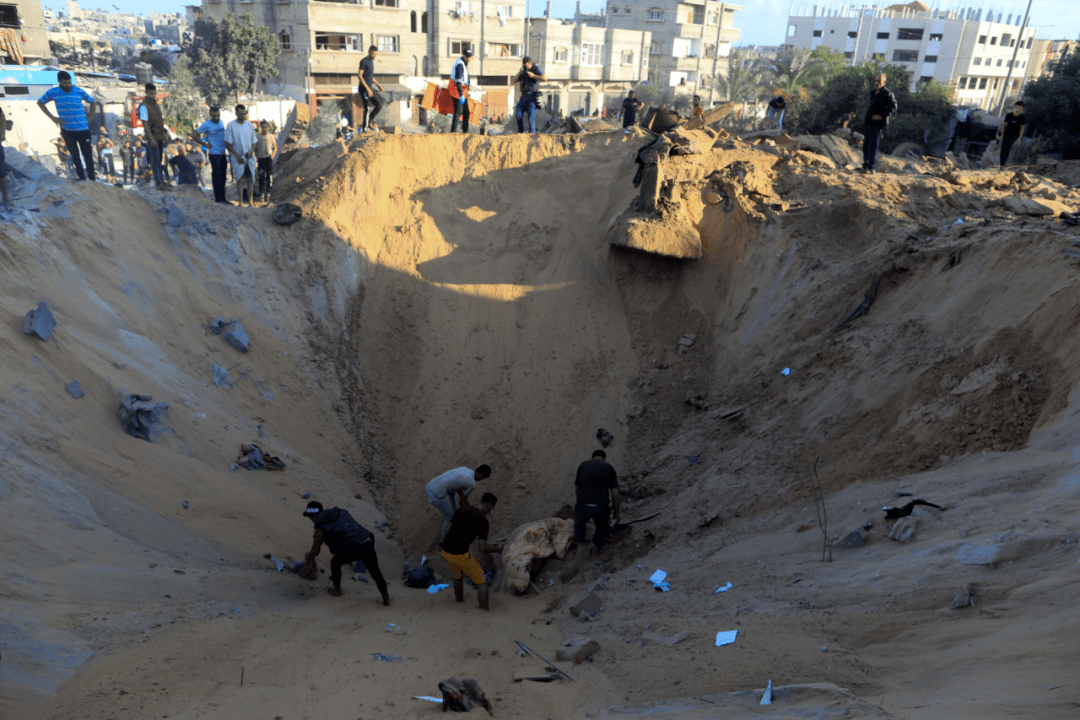 10月16日,在加沙地带南部城市汗尤尼斯,人们在遭以色列袭击后的建筑废墟中救援伤者。新华社发(亚西尔·库迪 摄)