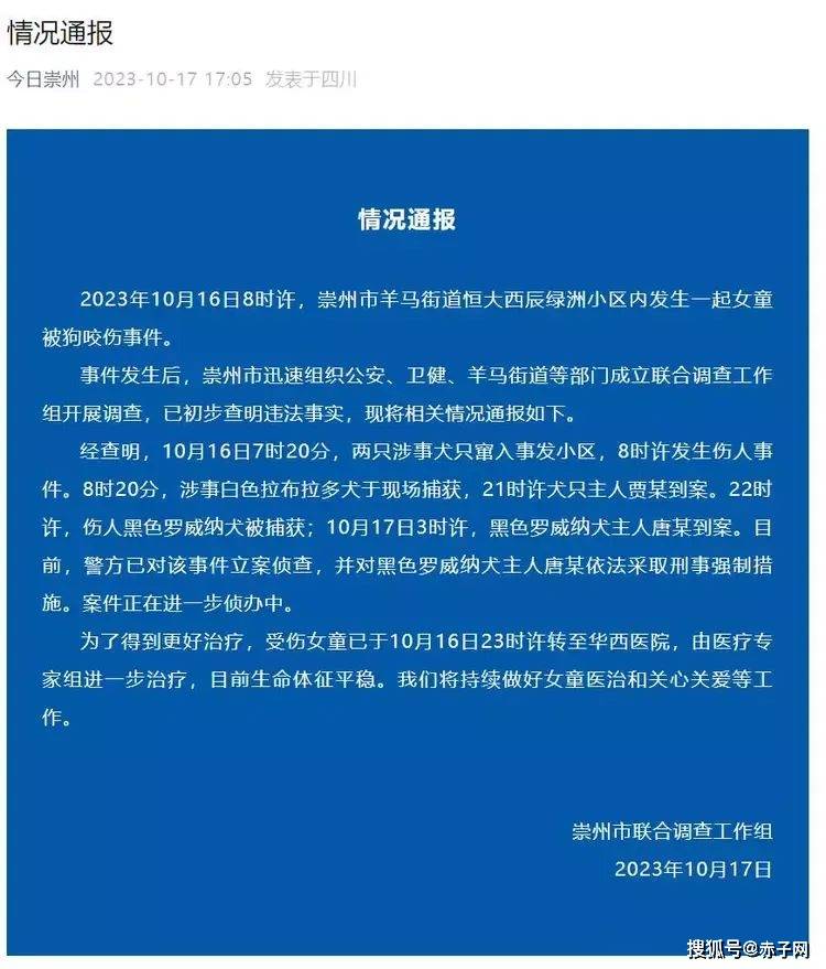 通报称,2023年10月16日8时许,崇州市羊马街道恒大西辰绿洲小区内发生一起女童被狗咬伤事件。