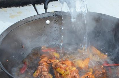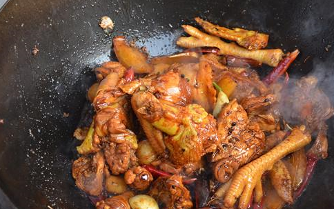 之后的炒菜过程就跟平时做菜一样,将所有的大料都用热油爆香,然后放入焯过水的鸡块,大火炒至五六分钟之后,直接加两条开水进去,盖上锅盖,将火调小,焖上一个小时,这样做出来的鸡才最有味道,每天这一排十几个火都不会停下,而且这样炖煮出来的鸡,一锅卖到88块钱,每天最少能够卖60锅,遇到夏天,人多的话,来吃这样的炒鸡,还需要提前预定,要不然也是白跑一趟,不少来这里吃过的顾客都说:值!
