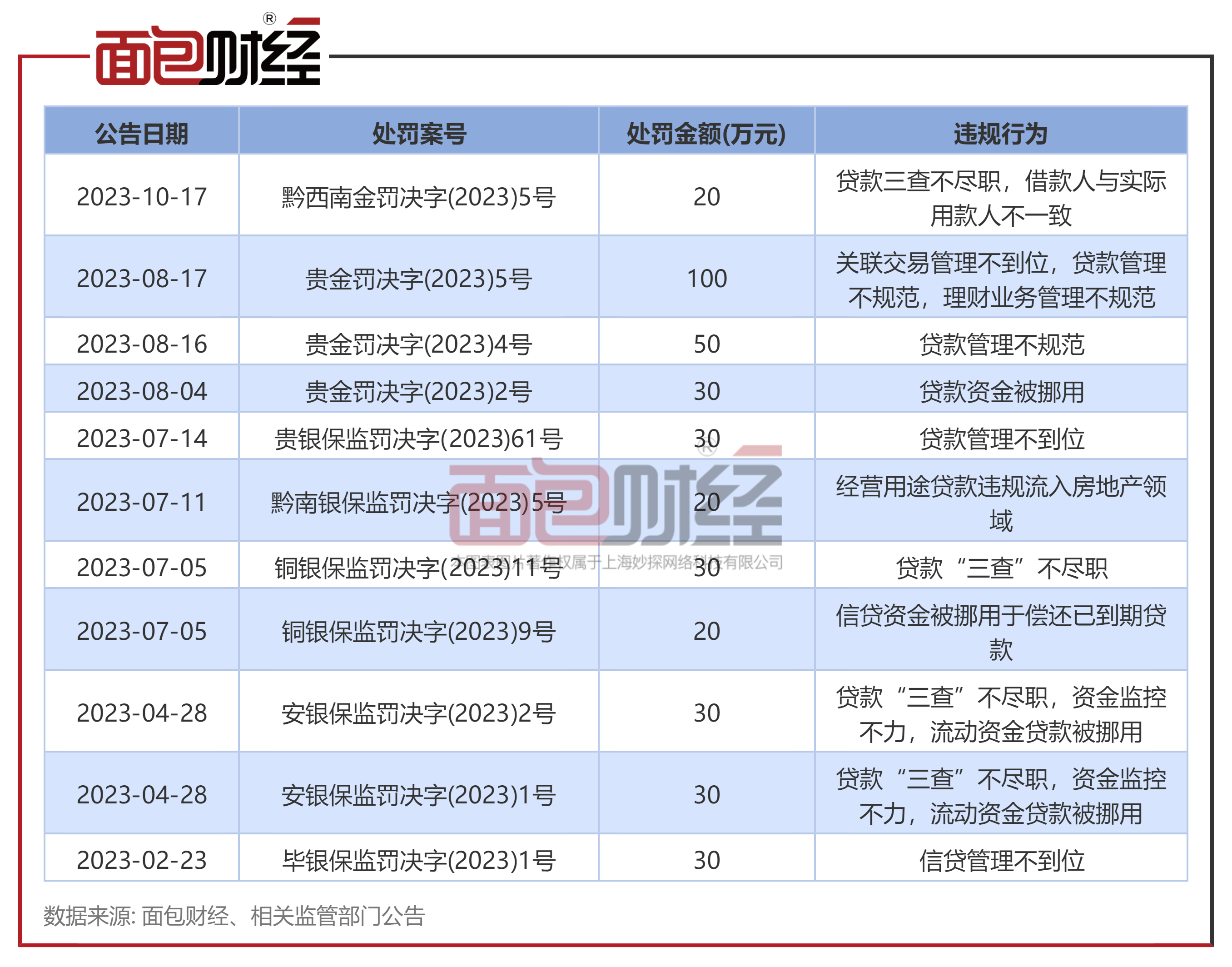 据不完全统计,以公司口径统计,2023年以来贵阳银行被原银保监会及国家金融监督管理总局累计开出11张罚单,累计被罚款金额达390万元,均涉及贷款业务。