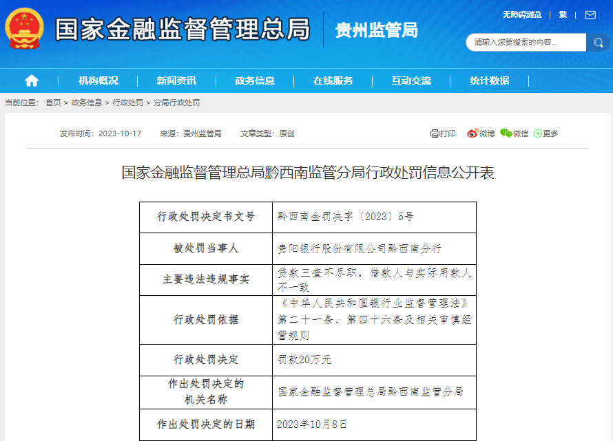 10月17日,国家金融监督管理总局黔西南监管分局行政处罚信息公开表显示,贵阳银行股份有限公司黔西南分行因贷款三查不尽职,借款人与实际用款人不一致,被罚款20万元。