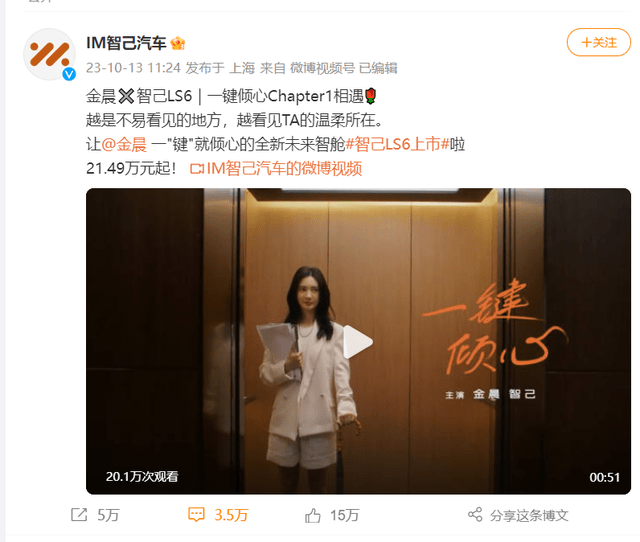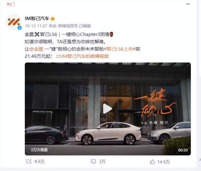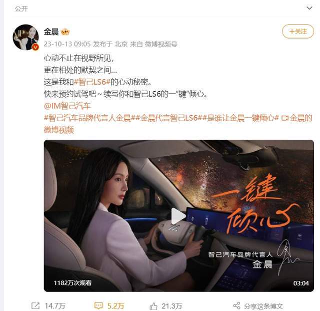 最近一周哪款新车最“火爆”?无疑是上汽智己LS6,在代言人金晨的微博传播加持之下,智己LS6在上市发布48小时之内(10月12日下19点-14日下午19点),全网传播数据曝光34万条声量。