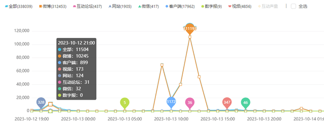 我们知道现有的多数新媒体平台在晚间的活跃度最高,上汽智己LS6的发布会也是定在10月12日晚间,而我们在传播时间曲线图上可以看到,在晚上7点开始就已经陆续有媒体进行传播的预热,而后在智己LS6正式发布后,晚上9点在全网传播出现了一个高点,微博在这里占据了明显的高位,而APP新闻客户端、网站和视频APP等平台,传播数据总量也仅为1000多条。