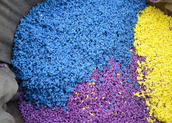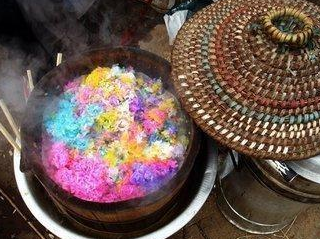 其实对于这样的一个美食来说,他也是壮族和苗族最传统的小吃了,所以在他们那个地区里,很多的人也都是很喜欢吃这种五颜六色的米饭,而且像这种米饭也并不是用染料染成的,而且也没有任何添加化学剂,所以是一个纯天然的植物,那么也是采用了五颜六色的蔬菜之后把它捣碎,然后再把米饭放进去,泡上几个小时的时间,接着再把米饭蒸熟之后就变成了这样五颜六色的颜色。