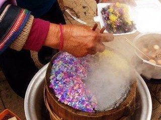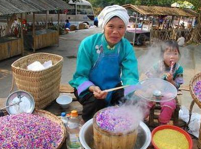 说到米饭的话,也是我们生活当中最常见的一个主食了,所以这样的一个美食也是我在五一逛街的时候看到的,所以路边也是偶尔见到了这样的一位大妈,穿着少数民族的衣服也是能够看得出来,他并不是我们汉族人,而且他旁边也是带了两个炉子,其中的一个炉子也是正在煮着一些茶叶蛋,但是另外一个炉子上面蒸的也就是五颜六色的米饭了,那么我们也都知道,平时吃的米饭基本上也都是纯白色的,但是对于大吗卖的这种米饭来说也是五颜六色的,所以很多的路人在经过之后看到了这样五颜六色的米饭,也都会觉得不敢去买,但是对于那些识货的人来说,也会觉得他是一个特别美味的东西,而且很多的人甚至也都会一连买上好几份的量,其实对于我来说也是一个对吃比较讲究的人,但是平时不仅喜欢吃上一些比较稀奇的东西,而且遇到了一些比较新鲜的东西之后,也是想要去尝试一下,但是当我看到了这样五颜六色的米饭之后,也肯定不会错过了它的存在,那么也就想要去尝一下它到底是什么样的美食。