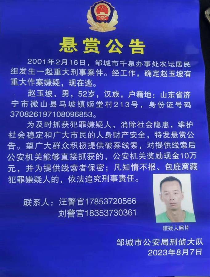 2023年8月,邹城市公安局刑侦大队发布《悬赏通告》,悬赏10万元通缉该案主要嫌疑人赵玉坡。通告显示,赵玉坡为济宁市微山县马坡镇姬堂村人,现年52岁。