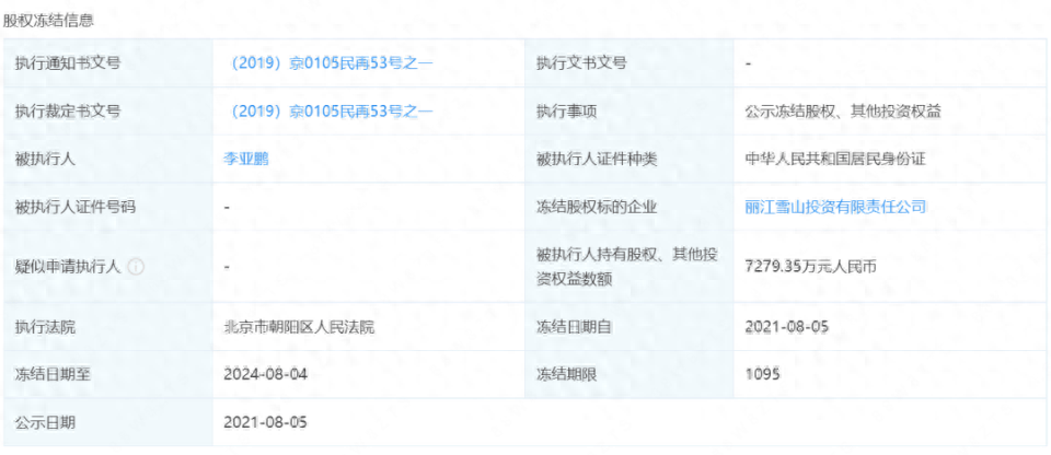此外,李亚鹏还有7279.35万元丽江雪山投资有限公司的股份被法院冻结。