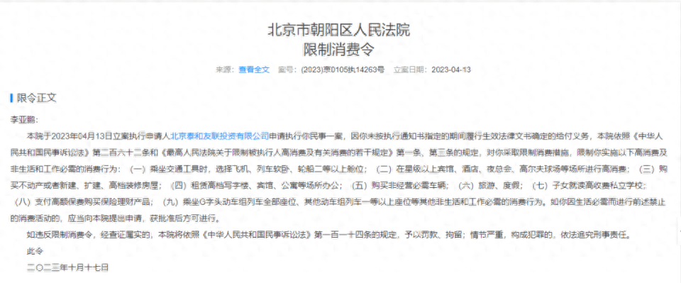 据天眼查App显示,近日,因未按时履行生效法律文书确定的给付义务,李亚鹏及哥哥李亚炜被限制高消费,申请人为北京泰和友联投资有限公司,执行法院为北京市朝阳区人民法院。