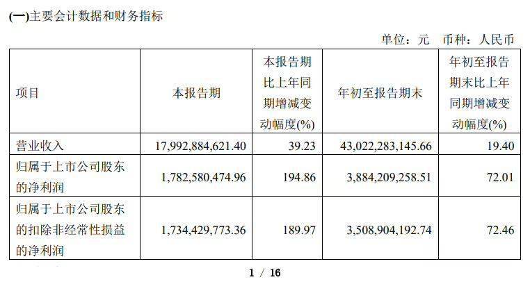 公司 2023 年前三季度实现营收 430.22 亿元,同比增长 19.4%;实现净利润 38.84 亿元,同比增长 72.01%;实现扣非后净利润 35.09 亿元,同比增长 72.46%。