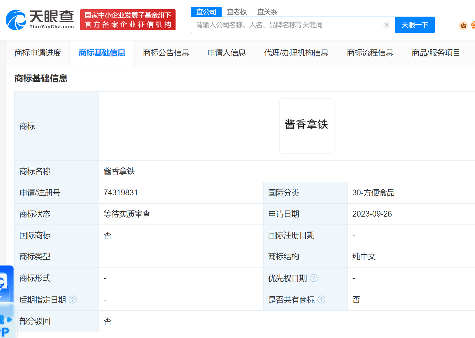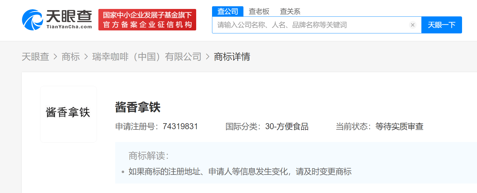 天眼查App显示,近日,瑞幸咖啡(中国)有限公司申请注册“酱香拿铁”商标,国际分类为方便食品,当前商标状态为等待实质审查。