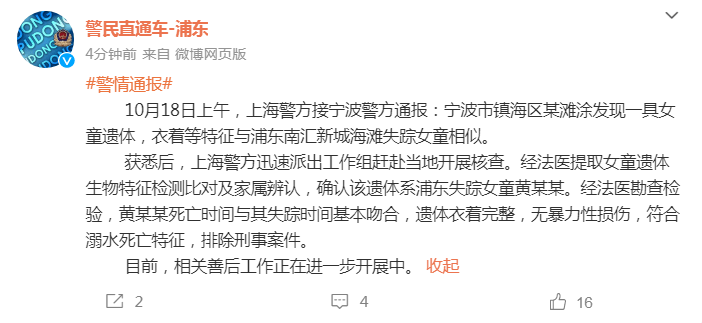 10月18日上午,上海警方接宁波警方通报:宁波市镇海区某滩涂发现一具女童遗体,衣着等特征与浦东南汇新城海滩失踪女童相似。