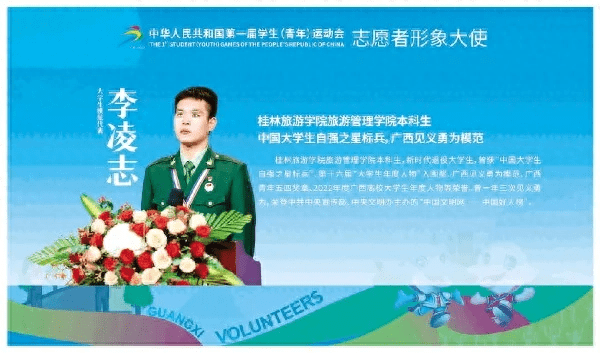 日前,自治区体育局发布第一届全国学生(青年)运动会志愿者形象大使名单,就读于桂林旅游学院的全州小伙李凌志成功当选第一届全国学生(青年)运动会志愿者形象大使。