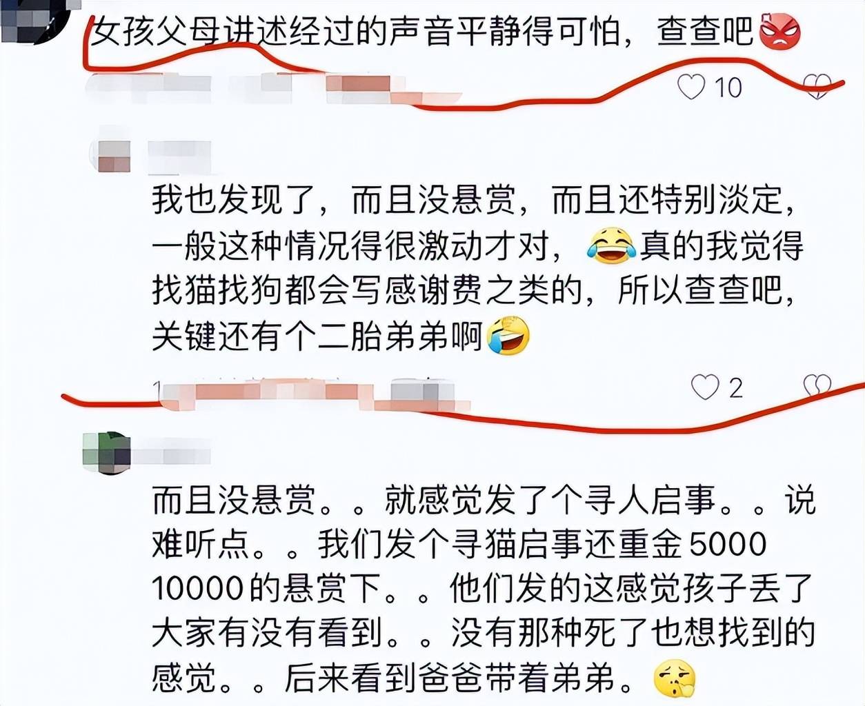 这件事在网上传开之后,不少人在网上提供线索,当然也有人在网上开始“阴谋论”,觉得是不是家里有弟弟,父亲故意让女儿走丢之类的,甚至还有人觉得父母冷静德可怕。
