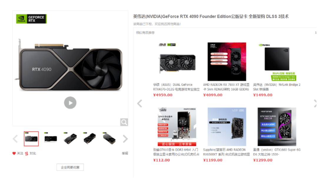 据界面新闻报道,10月19日,记者发现,英伟达RTX 4090系列显卡逐渐在电商渠道下架,目前,国内英伟达旗舰店已下架RTX 4090显卡,华硕、七彩虹等英伟达合作商也同样纷纷下架该型号的非公显卡,店铺均已显示无货状态。