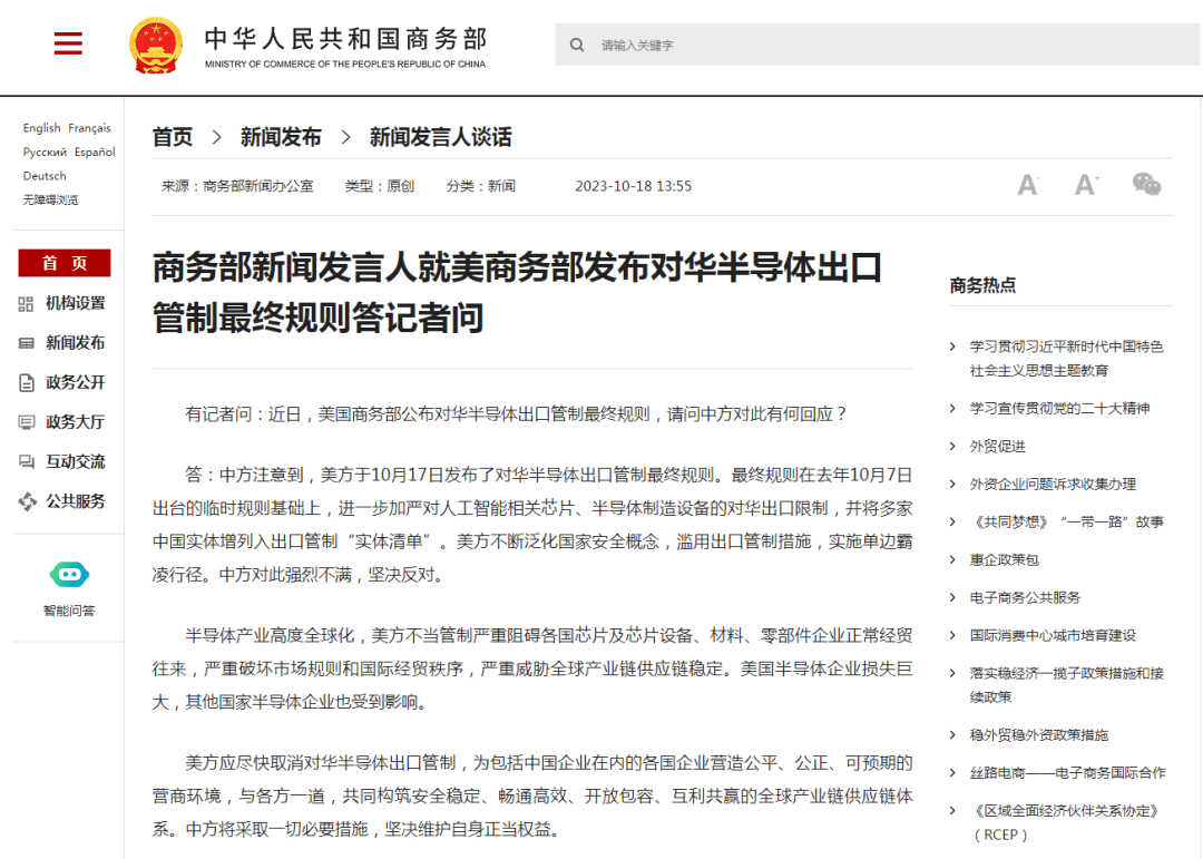 据商务部网站,10月18日,商务部新闻发言人就美商务部发布对华半导体出口管制最终规则答记者问。