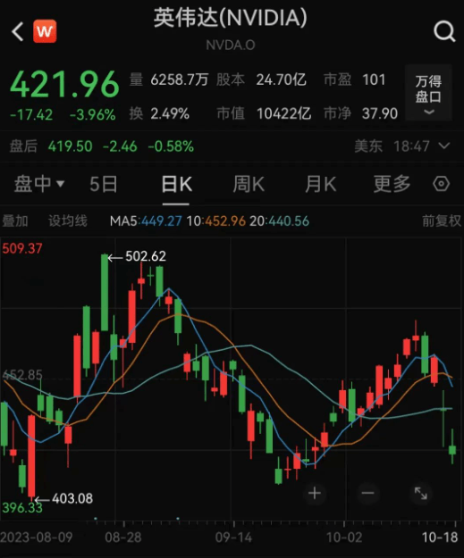 受此消息影响,截至10月18日美股收盘,英伟达(NVIDIA)报421.96美元,跌幅3.96%,市值1.0万亿美元。其股价已连续两日下跌,累计跌幅为8.64%,两日市值蒸发963亿美元(约7045亿元人民币)。