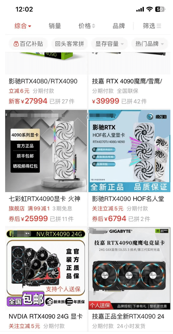 在拼多多搜索RTX 4090显卡,价格多为2万元至4万元不等,也有商家标出近5万元的高价。