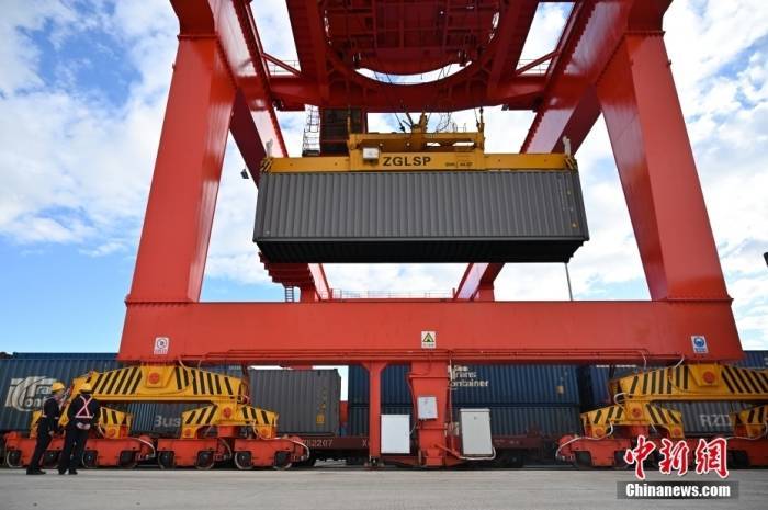 资料图:工作人员操作龙门吊对中欧班列进行换装作业。 中新社记者 刘文华 摄