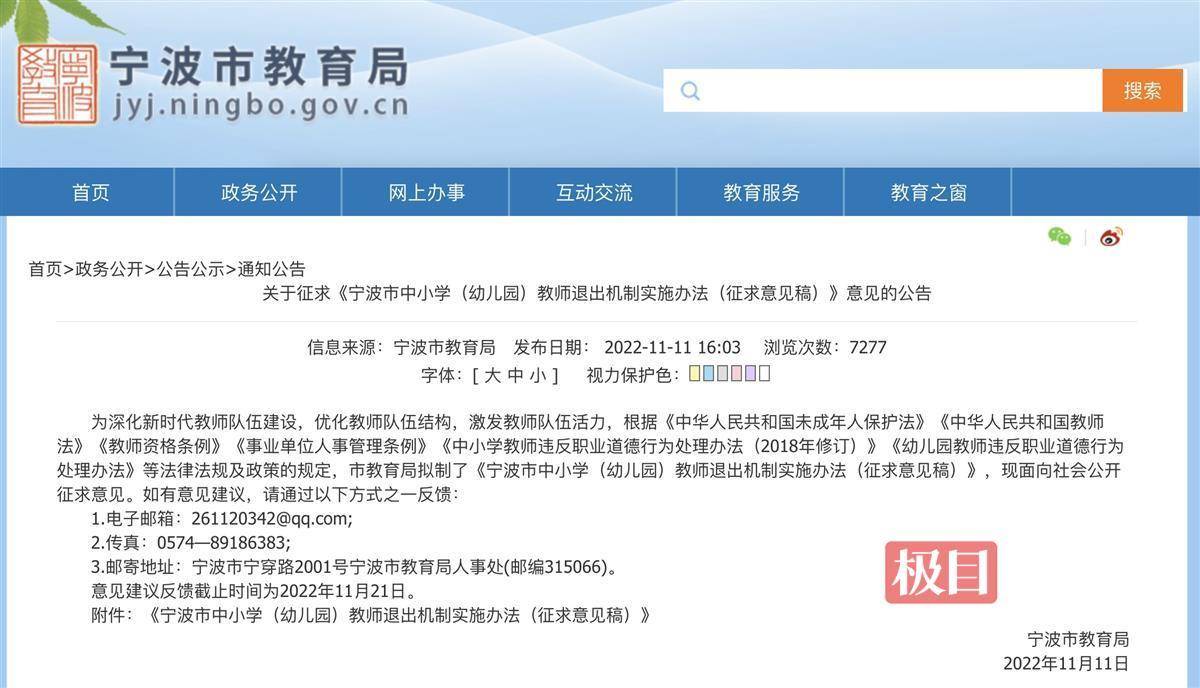 极目新闻记者注意到,2022年11月11日,宁波市教育局曾发布关于征求《宁波市中小学(幼儿园)教师退出机制实施办法(征求意见稿)》意见(下称“《意见》”)的公告。《意见》第二章对退出渠道的种类进行了解释,有旷工、渎职、考核不合格、有违法犯罪行为等情况的教师,学校可予以解聘。
