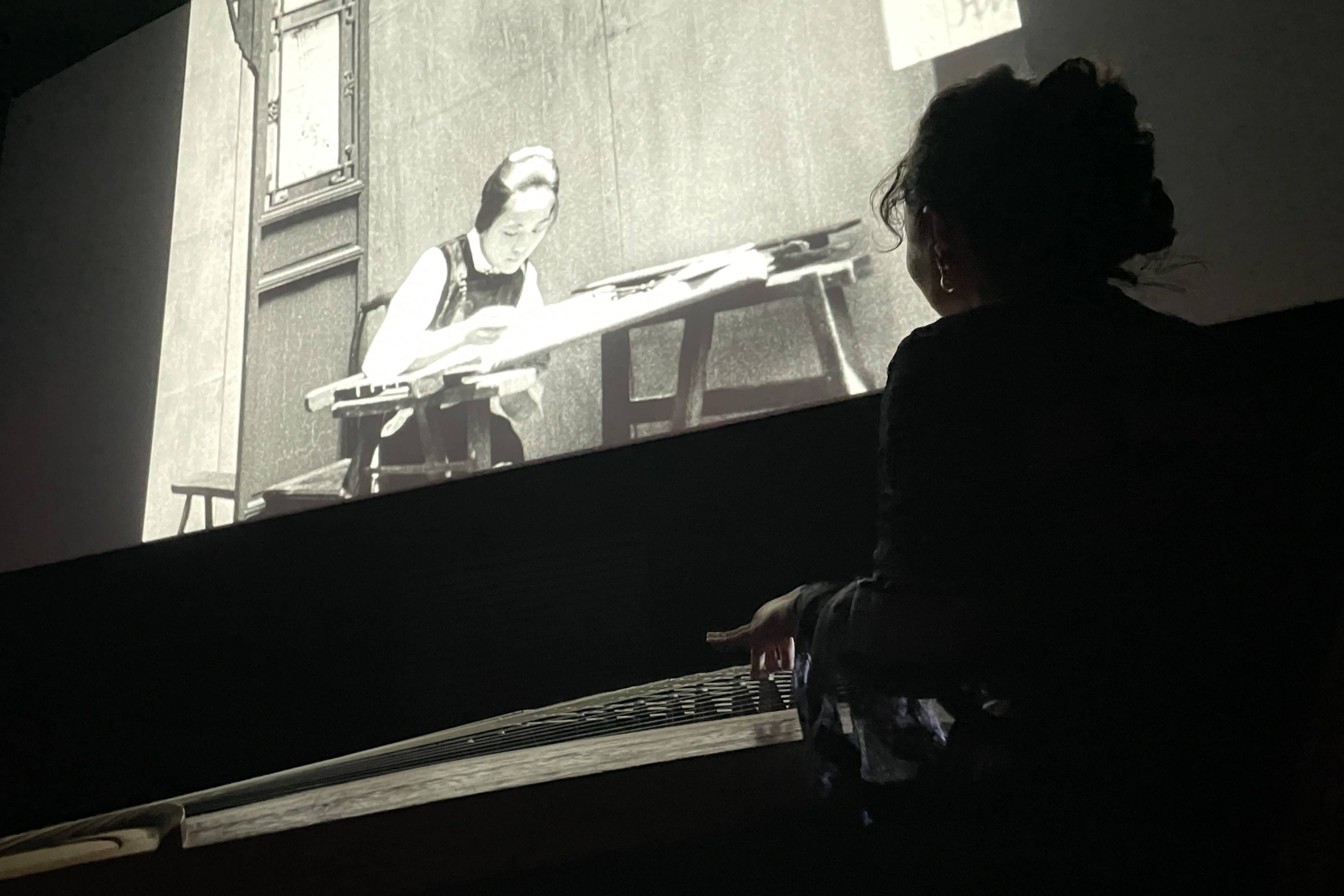 10月13日,在法国巴黎举行的第15届巴黎中国电影节上,古筝乐手安然为中国经典默片《掷果缘》现场配乐。 新华社记者 乔本孝 摄