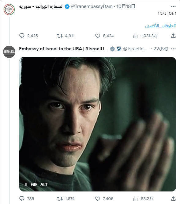 据美国福克斯新闻网站10月18日报道,在医院发生爆炸几个小时后,伊朗外交部长发推警告称以色列的时间“不多了”,伊朗驻叙利亚大使馆也发布推文“时间到了”。对此,以色列驻美国大使馆发了一张电影《黑客帝国》的表情包,作为回应。