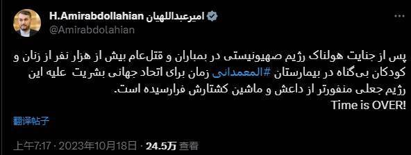 阿卜杜拉希扬写道:“在犹太复国主义政权实施可怕罪行,轰炸和屠杀医院里的一千多名无辜妇孺之后,全球人类现在是时候团结起来,反对这个比伊斯兰国及其杀戮机器更令人憎恨的假政权了。”