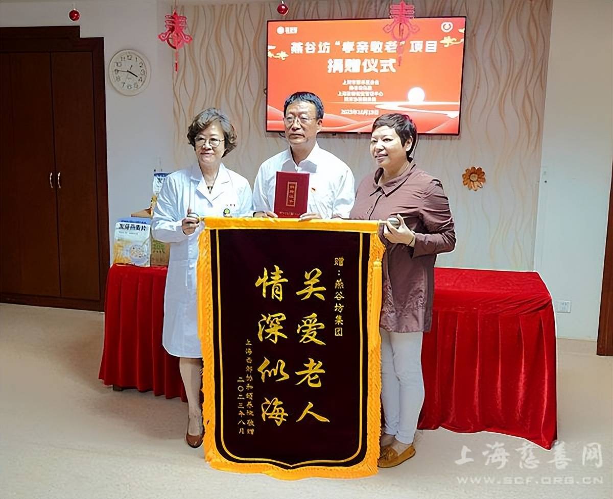 捐赠仪式在西郊协和颐养院举办,上海市慈善基金会副理事长丁斐平参加活动,代表市慈善基金会接受了燕谷坊的爱心捐赠,并向爱心企业颁发了慈善捐赠纪念牌。西郊协和颐养院院长王红玲也向燕谷坊赠送了爱心锦旗。