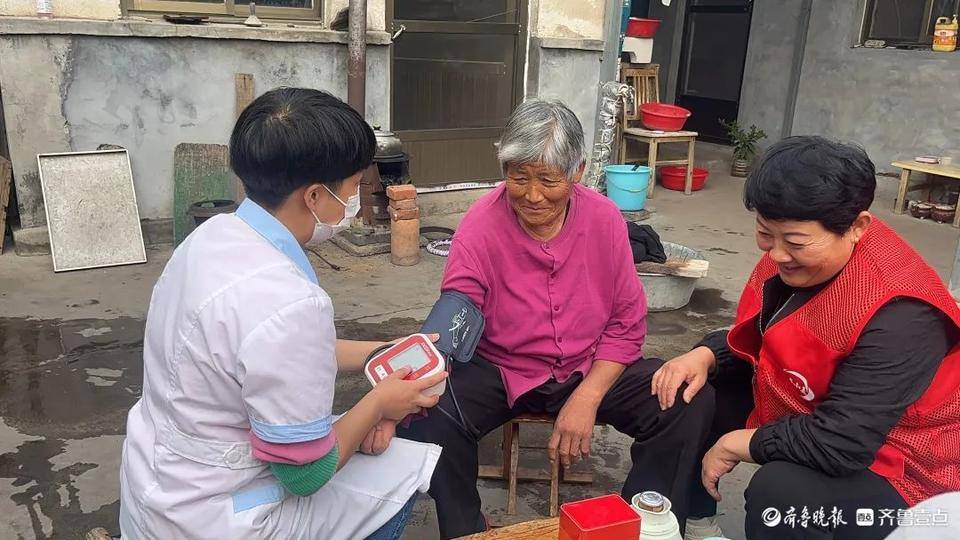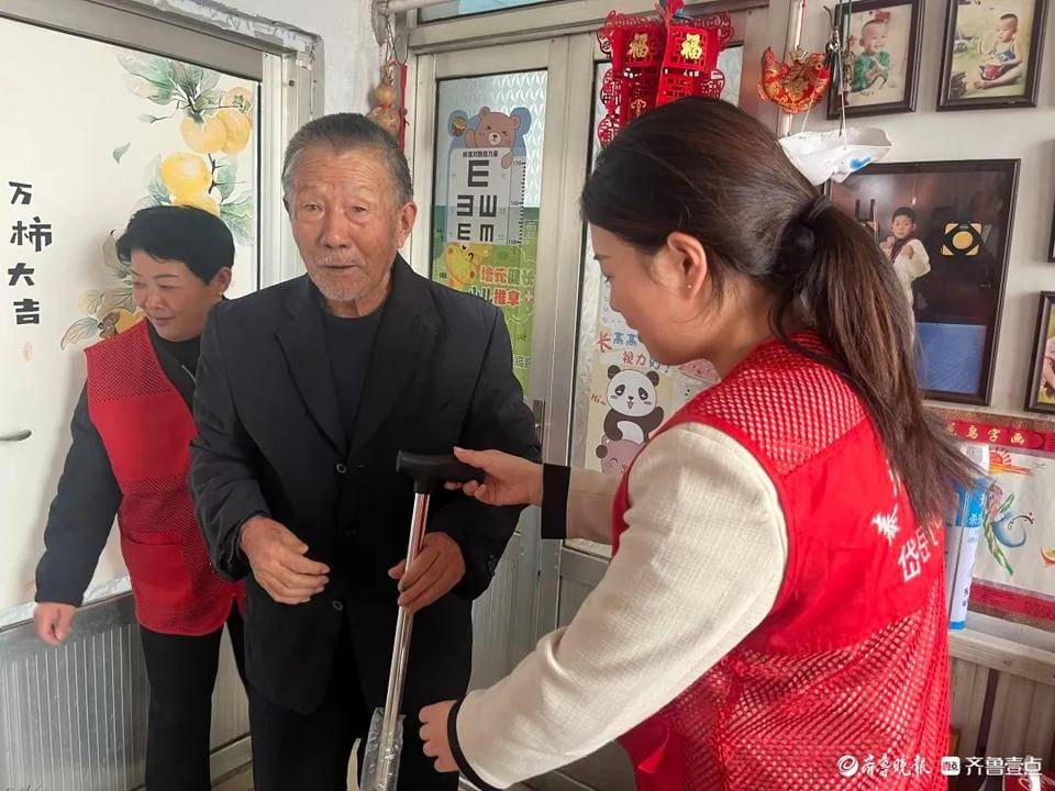 每到一户老人家,志愿者们都为老人送去暖心拐杖,为老人测量血压,针对秋冬季节是老年人疾病易发期的特点,通俗易懂地为老人讲解了多种疾病的预防及诊疗知识。
