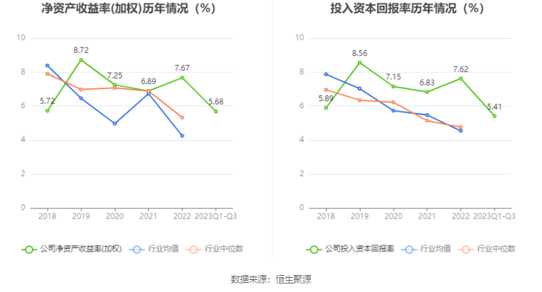 数据显示,2023年前三季度公司加权平均净资产收益率为5.68%,较上年同期增长0.55个百分点;公司2023年前三季度投入资本回报率为5.41%,较上年同期增长0.31个百分点。