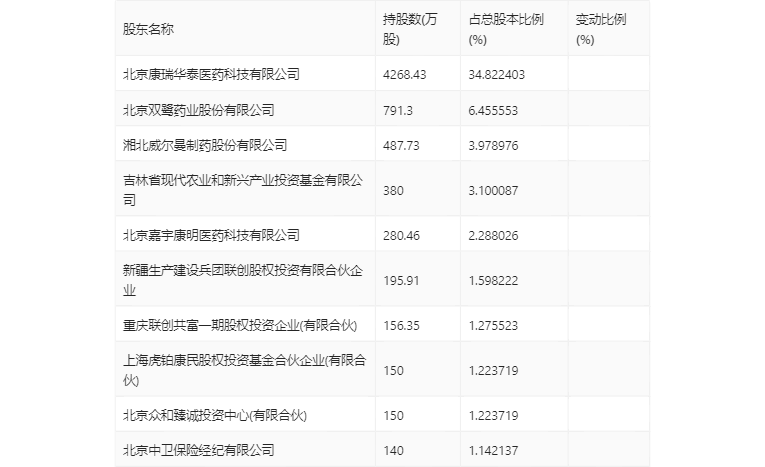 三季报显示,2023年三季度末的公司十大股东中,持股最多的为北京康瑞华泰医药科技有限公司,占比34.822%。在具体持股比例上,新疆生产建设兵团联创股权投资有限合伙企业持股有所下降。