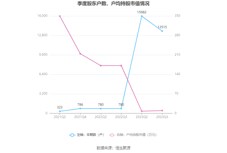 筹码集中度方面,截至2023年三季度末,公司股东总户数为1.35万户,较上半年末下降了2467户,降幅15.44%;户均持股市值由上半年末的7.66万元上升至9.72万元,增幅为26.89%。