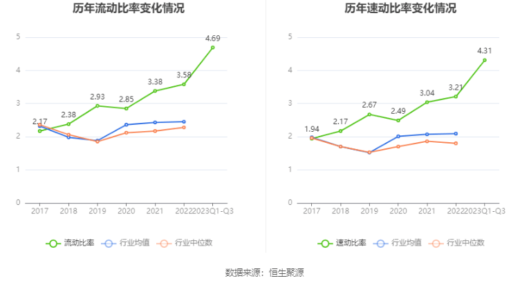 2023年前三季度,公司流动比率为4.69,速动比率为4.31。
