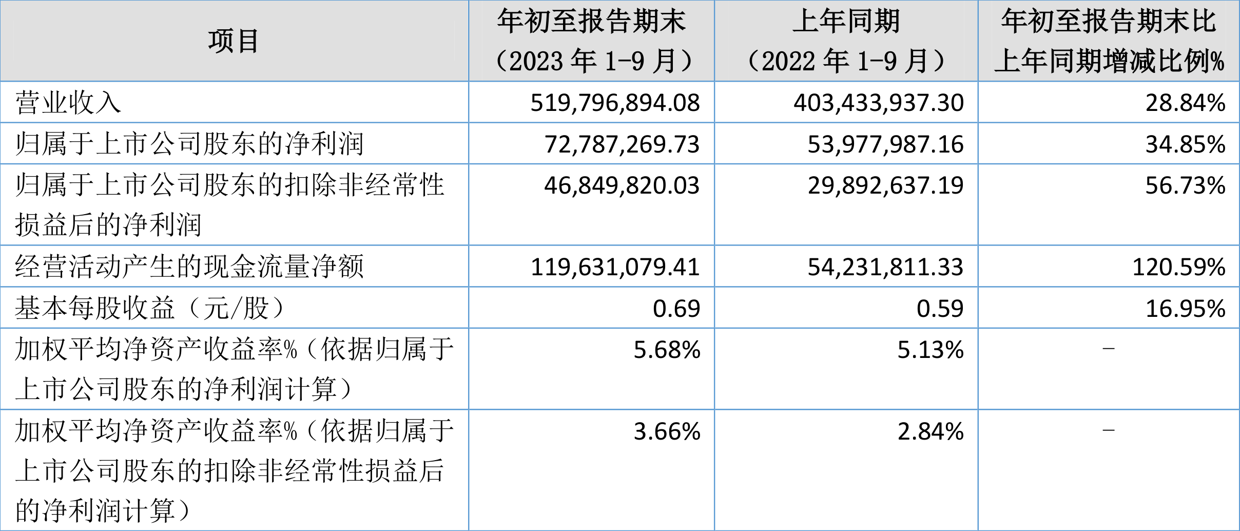 2023年前三季度,公司经营活动现金流净额为1.20亿元,同比增长120.59%,主要系年初至报告期末营业收入增长使销售商品、提供劳务收到的现金增加所致;筹资活动现金流净额3.29亿元,同比增加3.49亿元,主要系收到上市募集资金所致;投资活动现金流净额-2.33亿元,上年同期为-1.03亿元,主要系年初至报告期末购买理财产品增长所致。