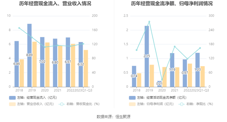 2023年前三季度,公司营业收入现金比为121.51%,净现比为164.36%。