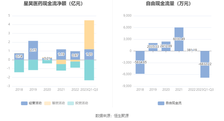 进一步统计发现,2023年前三季度公司自由现金流为-6832.22万元,上年同期为-7218.80万元。