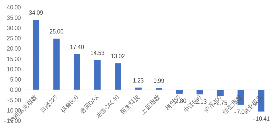 截止2023年8月底,沪深300指数跌幅2.75%,科创50指数跌1.8%,创业板指跌幅更大达到10.41%。同时期除港股市场恒生指数(跌7.07%)以外,其他海外市场总体表现显著优于国内市场,纳斯达克指数涨幅最大达到34.09%,日经上涨25.00%,标普500涨幅17.40%,德国DAX指数上涨14.53%,法国CAC40指数上涨13.02%。