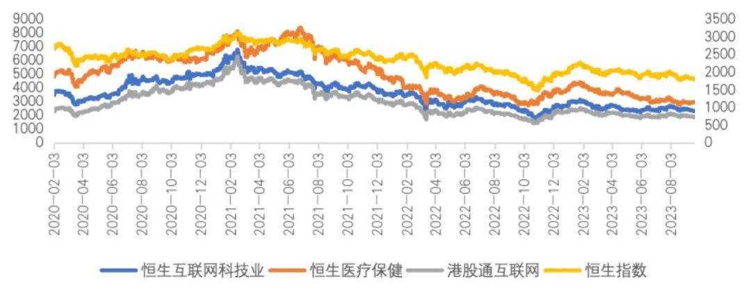 3只基金跟踪指数分别为港股通互联网(913637)、恒生医疗保健指数(HSHCI)、恒生互联网科技业指数(HSIII),指数的历史走势与恒生指数走势相关性较高,均是在2021年2月达到历史最高位之后经历了2年漫长熊市,随后在22年年底开启了一波反弹,至2023年1月底阶段性行情结束。今年初至8月底,3个指数的区间涨跌幅分别达到-12.82%、-23.28%、-9.52%。