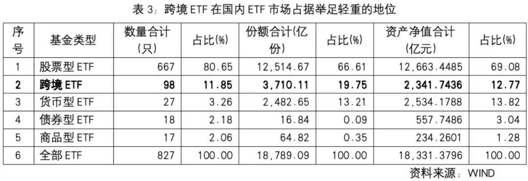 2012年10月22日,A股第一只跨境ETF(H股ETF)在上交所上市。2013年5月,第一只投资国外市场的ETF(纳指ETF)在上交所上市。经历了10余年的发展,跨境ETF基金数量和管理规模实现了高速的成长。截止2023年8月底,沪深两市共有98只跨境ETF基金产品,产品数量占全部ETF基金11.85%,仅次于股票型ETF;跨境ETF基金份额达到3710.11亿份,基金资产净值达到2341.74亿元,同样仅次于股票型ETF基金,在国内ETF基金市场占据举足轻重的地位。