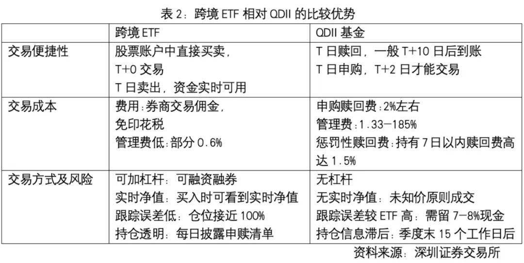 并且,相比较同为海外资产配置的普通QDII基金而言,跨境ETF在交易成本、交易便捷性和交易方式等方面也具备较大的优势。