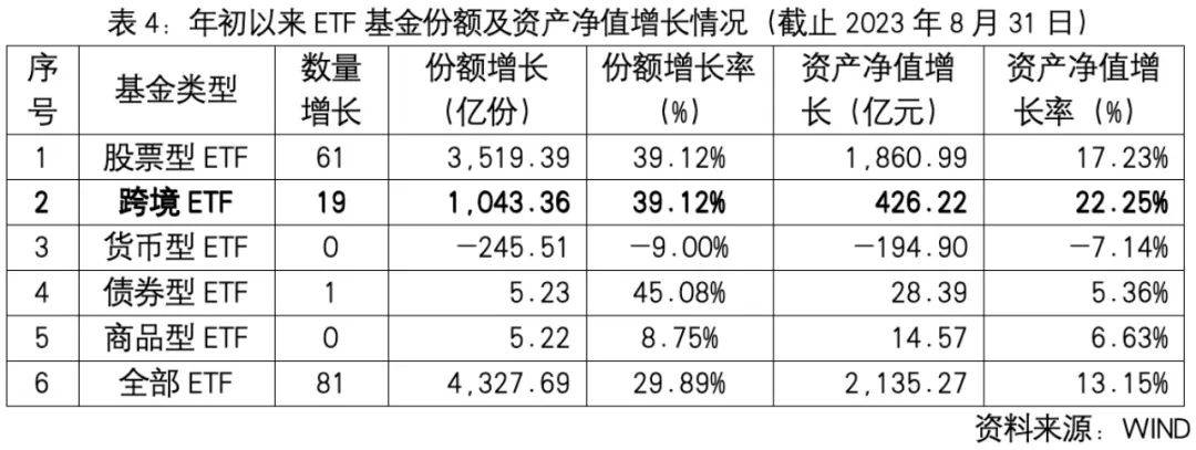 自年初以来,各类非货币型ETF 规模均有不同程度增长,股票型ETF 和跨境ETF增长幅度较大,分别增长1846.89 和426.22 亿元,跨境ETF规模增长率甚至高于股票型ETF达到22.25%,属于ETF基金规模增长率最高的品种。同样,从基金份额来看,股票型与跨境ETF基金份额分别增长1,860.99、426.22亿份,二者增长率持平,均实现了39.12%的高增长率。