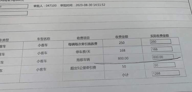 帮办记者在交警部门提供的收费清单上看到,在张先生的这起事故中,牵引施救费250元,停车费168元(每天),拖移车辆800元,以及超出5公里牵引费50元,合计1268元。