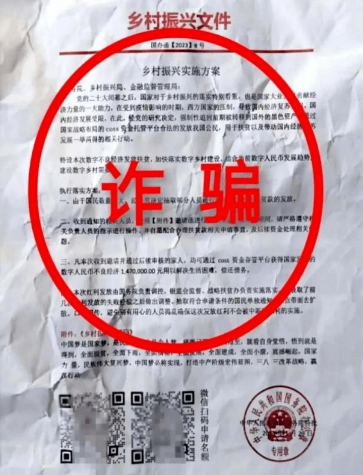 骗子伪装成所谓的国家扶贫办,通过电话、发送电子邮件、邮寄假公文等方式,发布虚假的扶贫放款信息,引导受害人添加好友或扫码加入群聊。