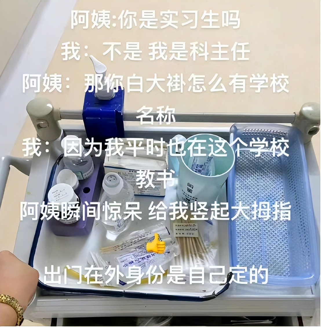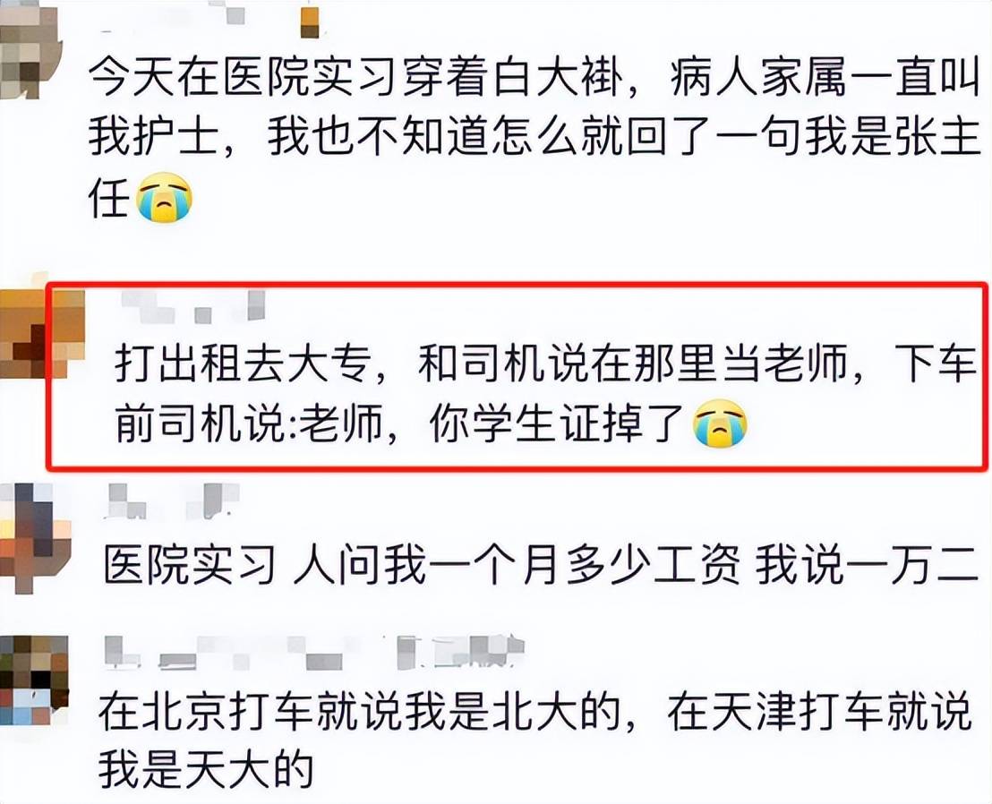 但是至于怎么说、说什么,可就完全凭学生心情了,就比如医学生在工作的时候被是不是实习生,学生想都没想就说自己是科主任,被问到白大褂上怎么有学校名称的时候,更是直接说自己在这个学校教书,该说不说这身份不就来了吗?难怪阿姨会被拿捏住,还以为自己遇到了权威呢!